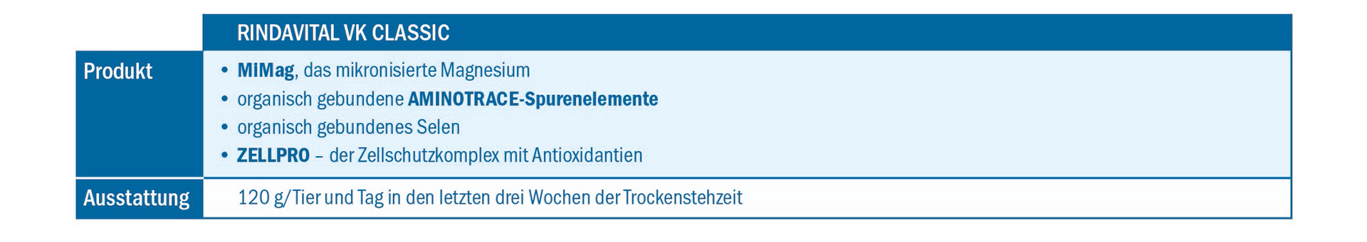 Već nekoliko desetljeća linija proizvoda RINDAVITAL VK pruža koncepte za hranidbu u suhostaju specifične za svaku farmu koje ISF Schaumann Istraživanje neprestano razvija na temelju najnovijih znanstvenih otkrića. Fokus je stavljen na opcije za sigurnu profilaksu mliječne groznice i ciljanu uporabu aktivnih sastojaka za potporu metabolizmu vezanom za period oko teljenja. Uz koncepte za profilaksu mliječne groznice, dodani vitamini i mikroelementi u novim proizvodima RINDAVITAL VK također su prilagođeni i to trenutnim preporukama za opskrbu krava.