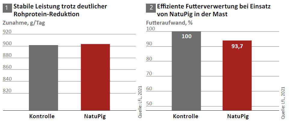 NATUPIG koncept za tov svinja neovisno je testiran prošle godine na Farmi za učenje i ispitivanje u Schwarzenauu / Bavarski državni institut za poljoprivredu (LfL). Trenutne procjene studije potvrđuju: Upotreba NATUPIG-a u tovu smanjuje izlučivanje dušika (N), fosfora (P) i teških metala (uglavnom bakra i cinka), a udio proteinskih komponenti (ekstrahirane sojine sačme) može se smanjiti bez gubitka performansi.